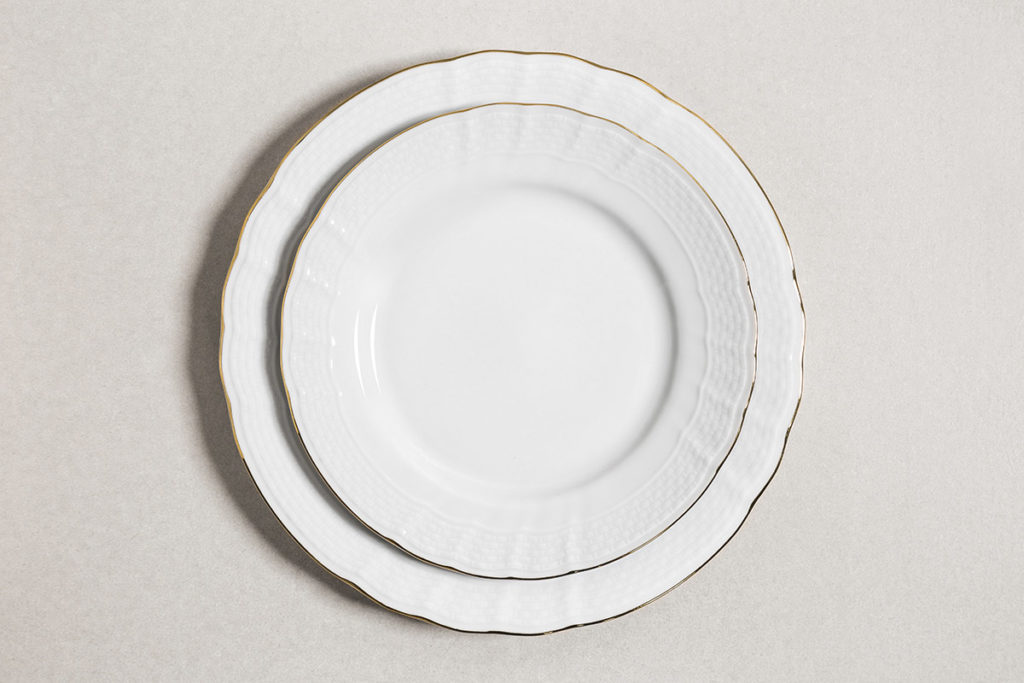 Un toque especial de dorado en los bordes ondulados y una textura entretejida hacen de esta línea un clásico.