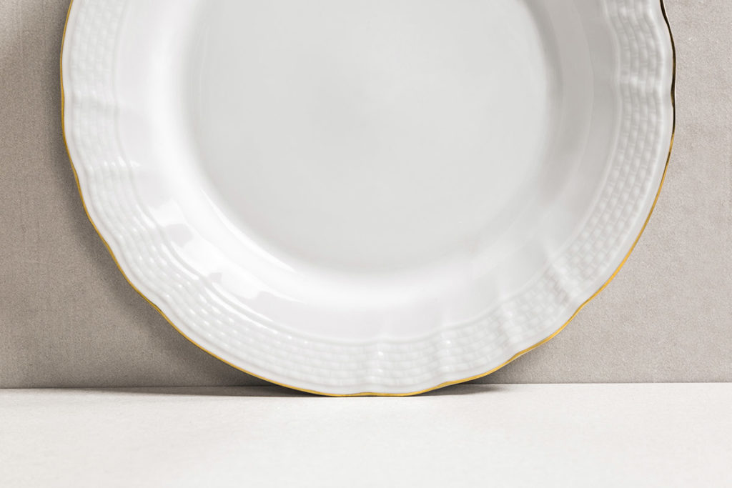 Los bordes ondeados se lucen con el brillo del oro, acompañado de un diseño sutil, crean una mesa para agasajar.