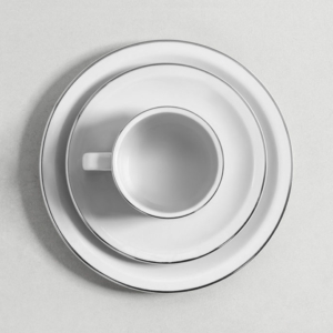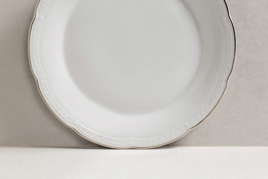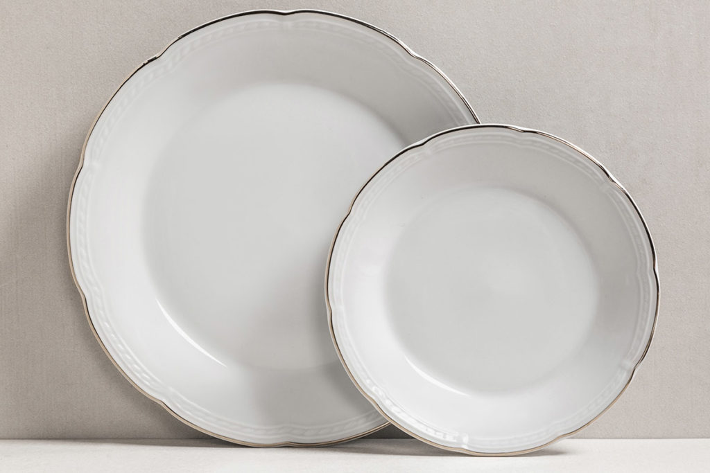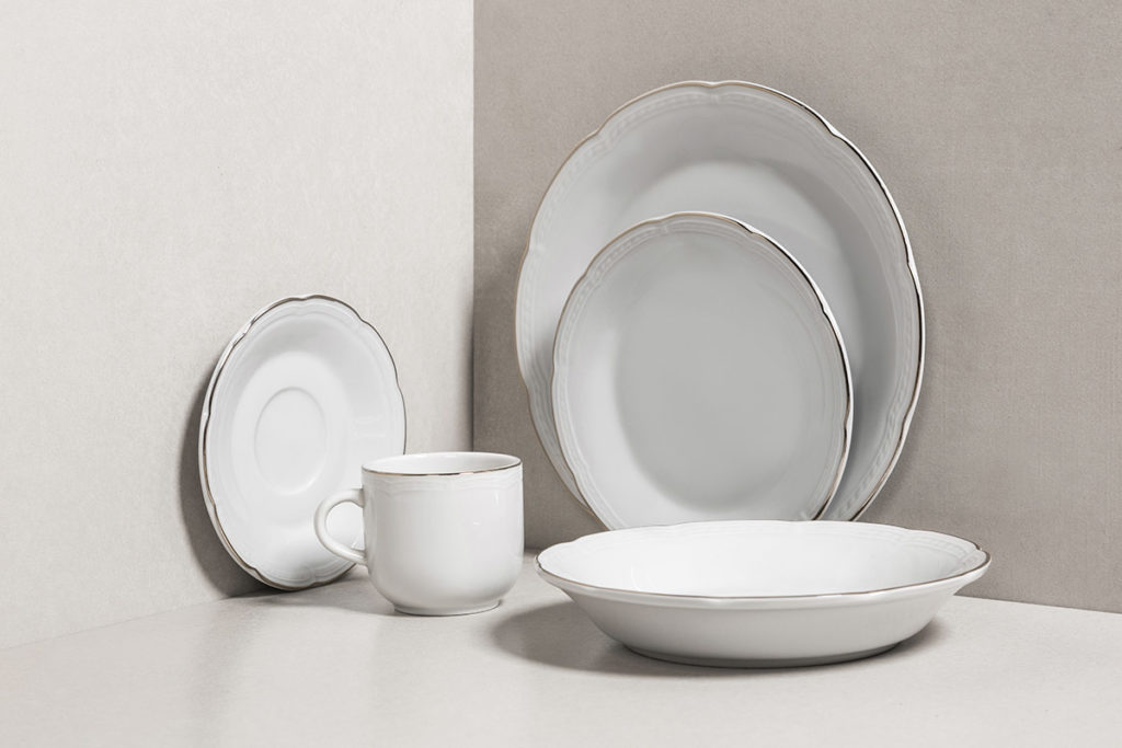 Las curvas suaves de esta línea, acompañadas con una textura táctil y un ribete dorado, con gran versatilidad para ambientaciones elegantes y rústicas. El ribete dorado resalta el borde delicado de los platos, con un ala ancha que luce la fina textura.