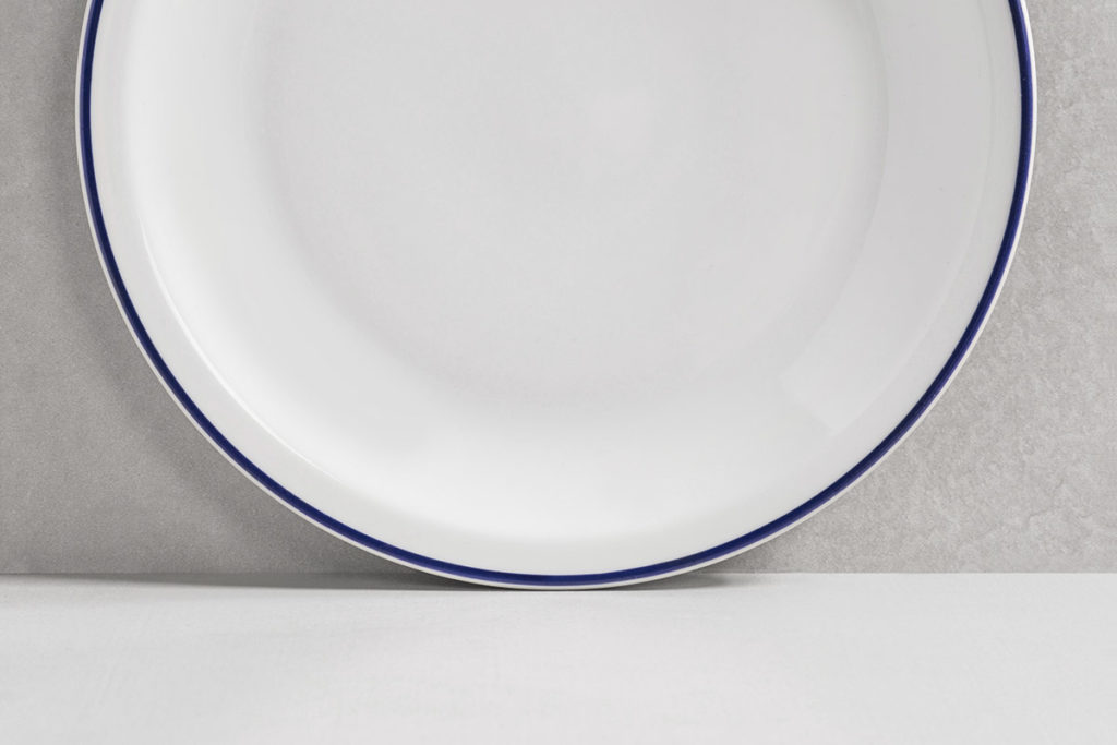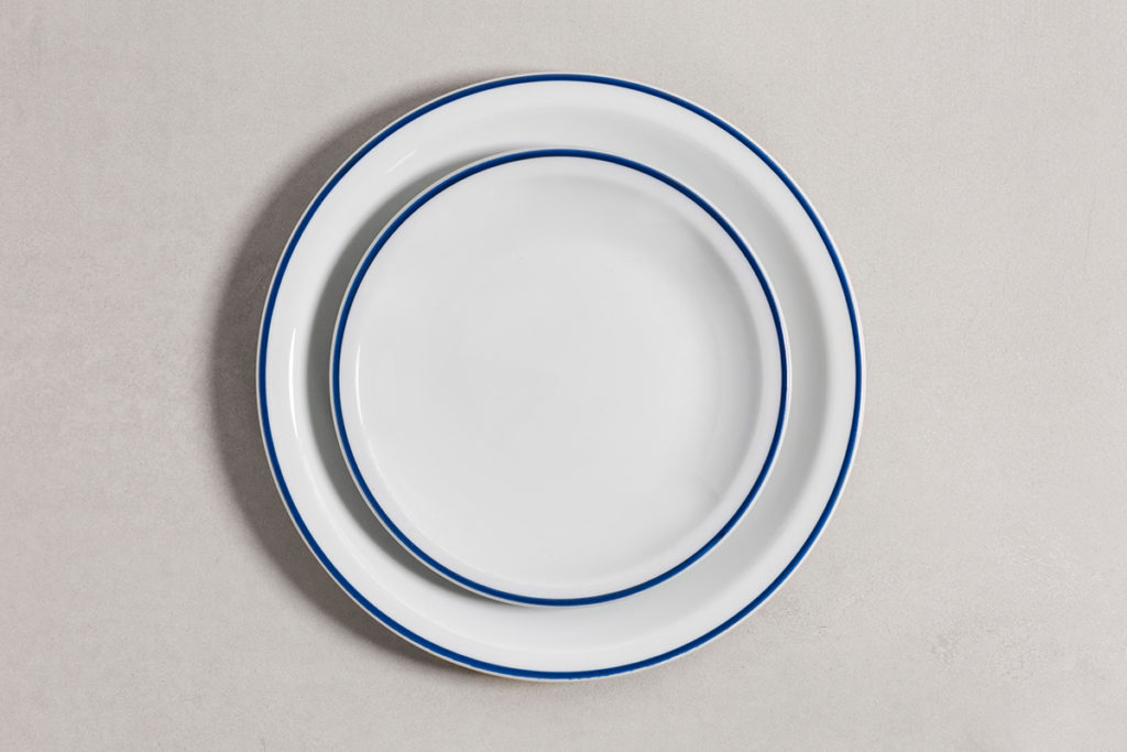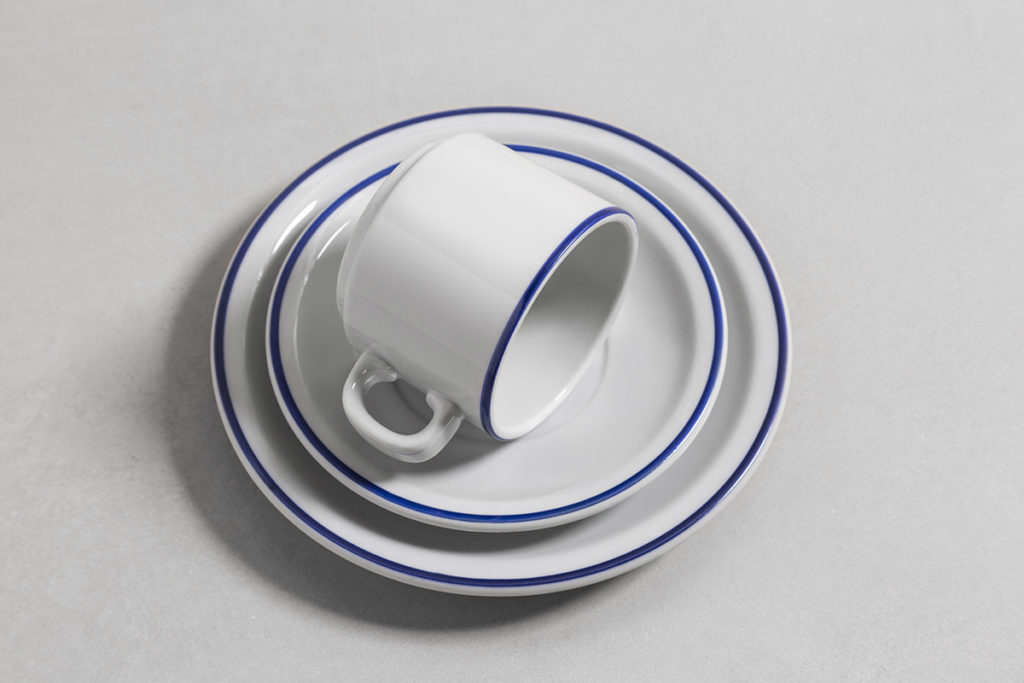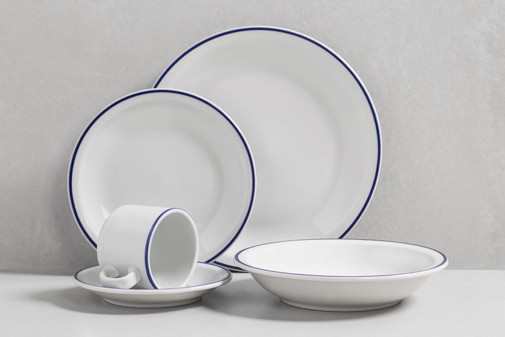 Un trazo azul acompaña los bordes de las piezas, con un diseño apilable, práctico para el guardado.
