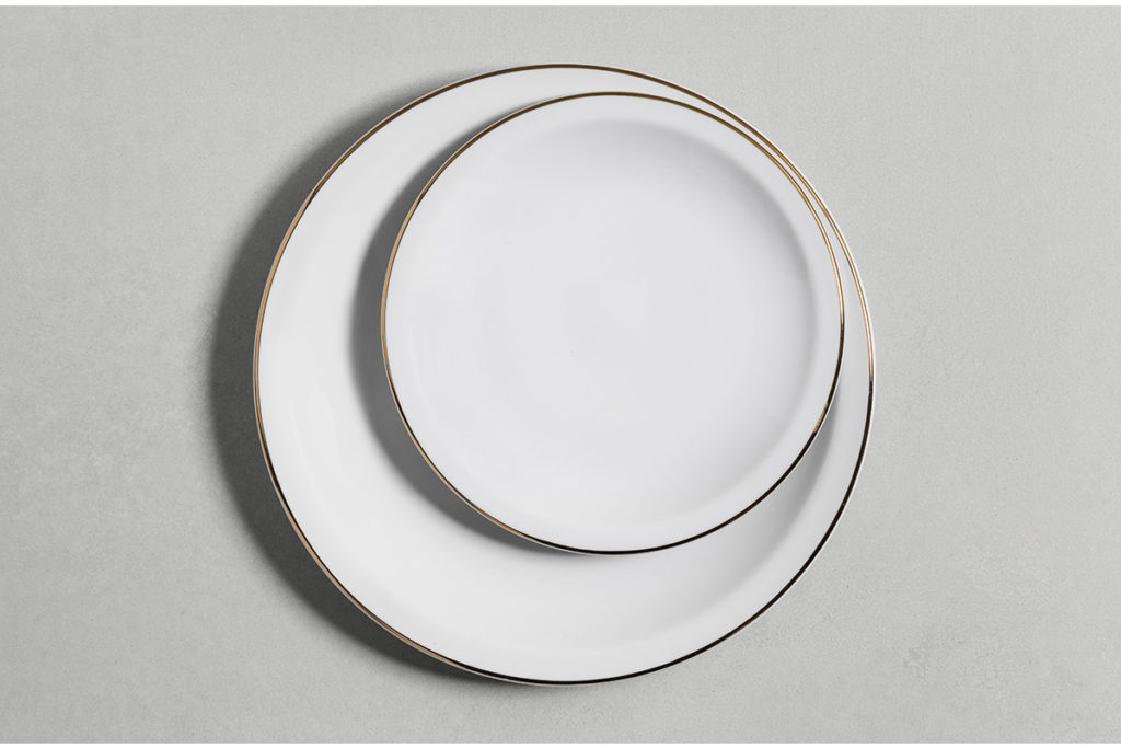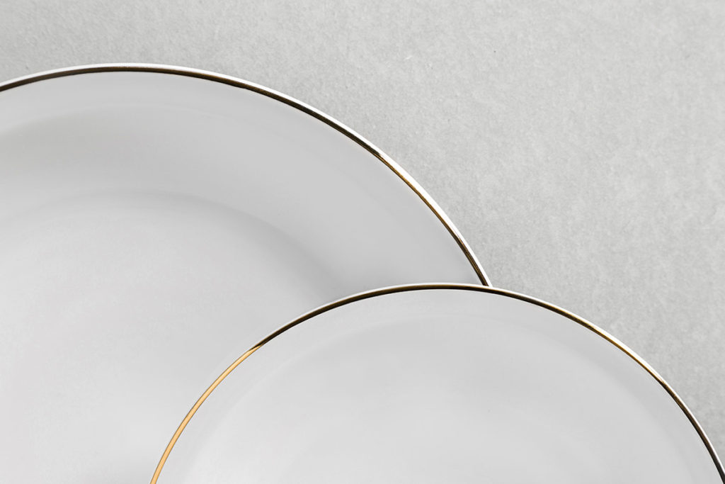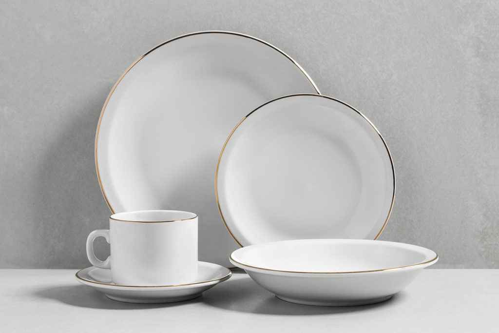 Un trazo dorado le da brillo y calidez a esta línea moderna y versátil, especial para una infinidad de estilos de ambientaciones. Las alas finas de las piezas, brillan con el dorado suave y delicado del decorado.