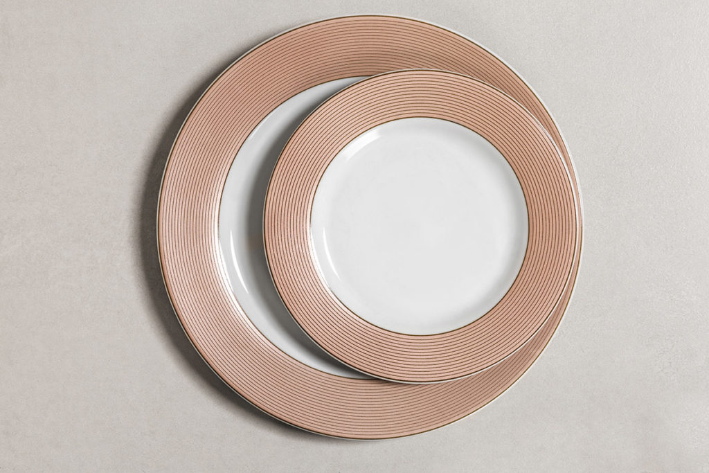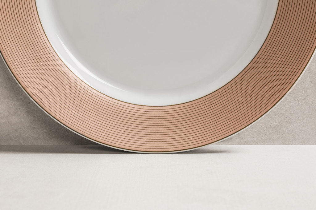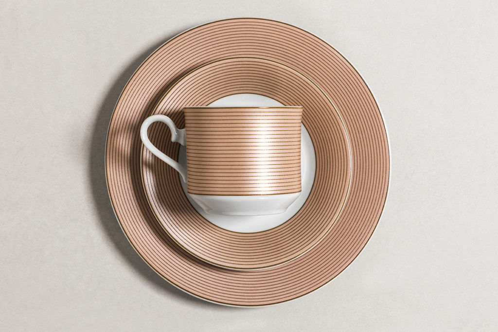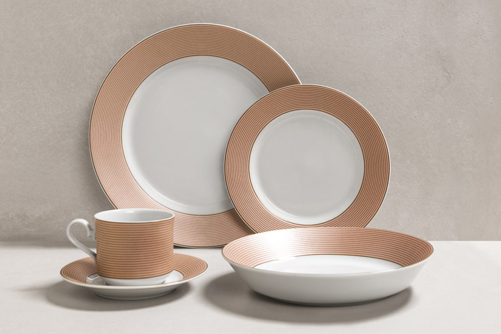 El diseño envuelve el cuerpo de la taza, combinando el color cobrizo tan característico de la línea con el blanco cálido de la porcelana. Los platos exhiben alas amplias, acentuando la modernidad del decorado. Un diseño moderno, las finas líneas acompañan la forma sintética de la vajilla. Un color cálido que ilumina el ambiente.