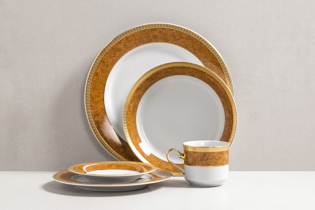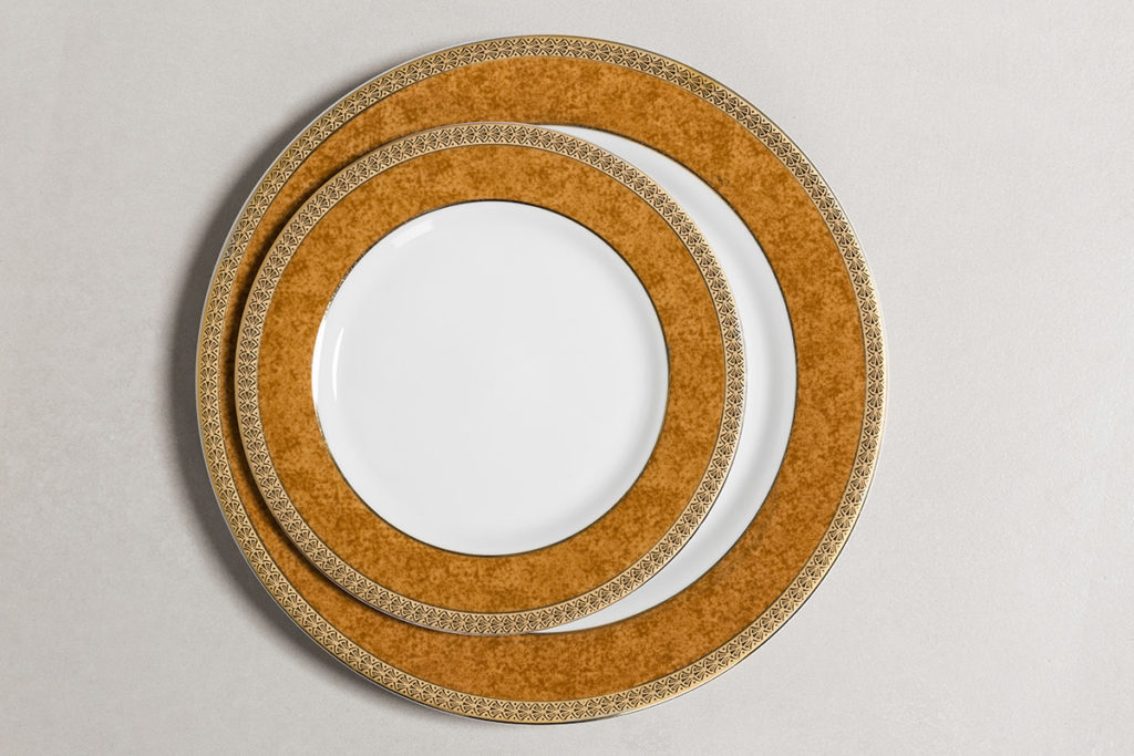 La taza contiene distintas notas de dorado: líneas finas, gruesas y guardas le dan vida a una pequeña pieza. Los platos exhiben nuestro diseño con gran detalle y un color memorable.
